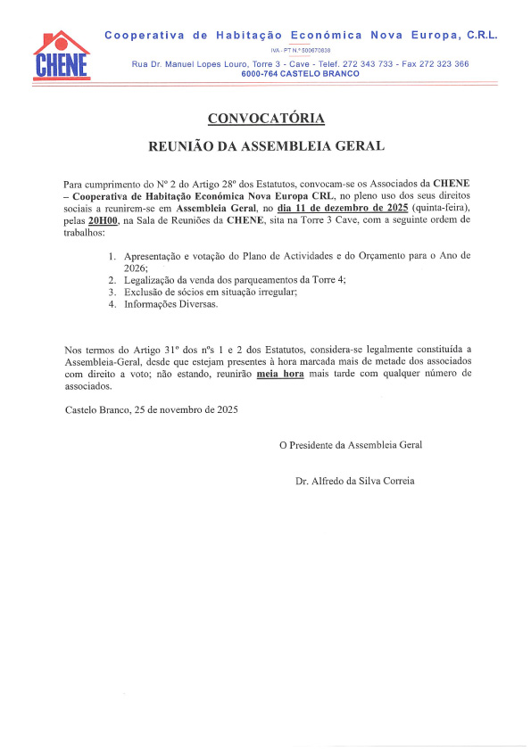 A Direção da Cooperativa CHENE, nos termos legais, vem por este meio convocar todos os Associados para a Reunião da Assembleia Geral, que se realizará: